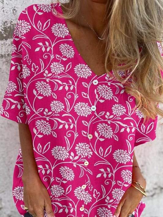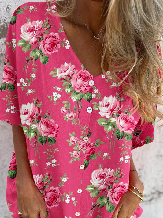 Women's Elegant Simple Floral Pattern V-Neck Cardigan Cotton and Linen Top