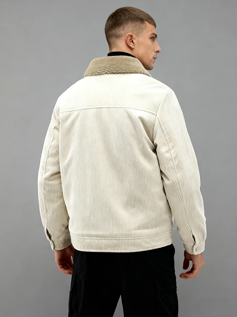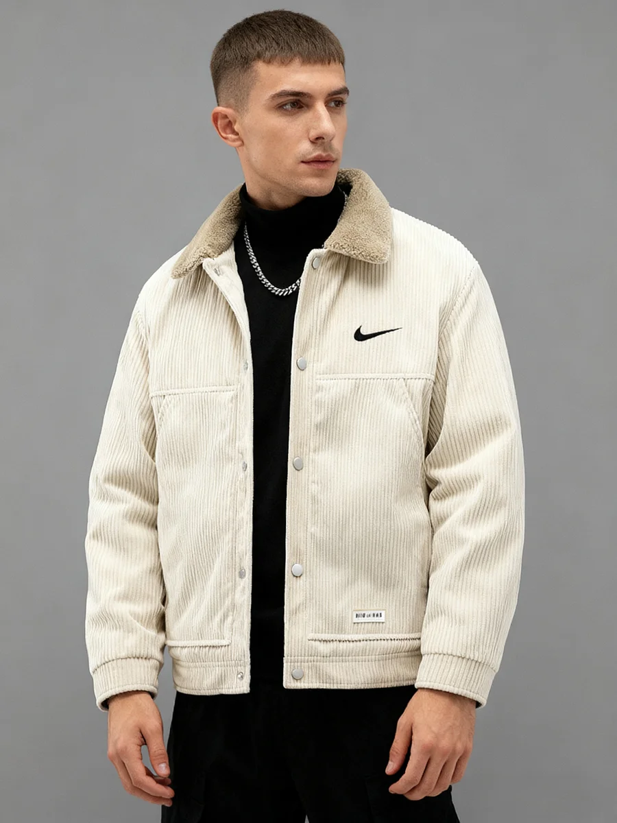 This is a men's jacket made of off-white corduroy, with a casual and retro design style. There is a clear Nike brand logo on the front, adhering to the brand identity; it also has a multi-pocket design, which is both practical and decorative.
